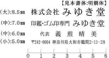 1行ごとに組合せが可能なゴム印です。 ご希望の向き(タテ・ヨコ)と文字のサイス・、書体を指定し、 原稿をご入力ください。 印面の厚みは文字サイズによって変わります。 文字サイズ大の場合は8.5mm、中の場合は7mm、 小の場合は5mmとなります。