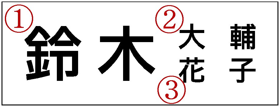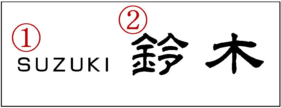 ※原稿が@のみの場合は、A・Bは空欄でお願いします ※「名前の部分だけ太くしたい」「文字に斜体をかけてほしい」など、他にご希望がある場合はカート内の【備考】欄にてご用命ください 旧字をご指定の場合、エラーが出る場合があります。その場合は一般文字を入力した上で カートに入った後の「備考欄」に旧字をご入力頂きご指定ください。 |
