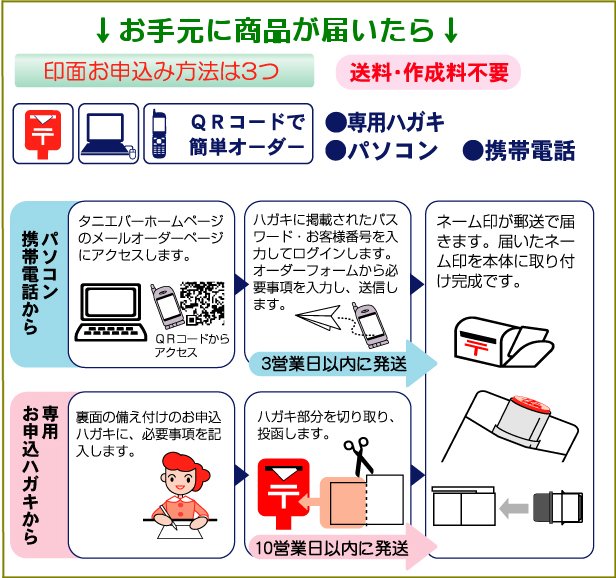 | この商品は『メールオーダー式の商品です。 お手元にはデコレーションされたネームペン(印面なし)と、個別シリアルbェ記載された専用注文書が同封されており、下記の方法でお客様が自身で注文し後日印面部がお手元に送付されてくる…という商品です。 |